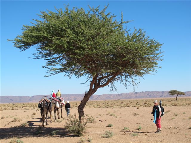 Direct na zonsopkomst, wat telkens weer een prachtig gezicht is, staan we op. Je ervaart de aangename warmte van de eerste zonnenstralen. Na het inpakken van je spullen volgt het ontbijt. De kamelen worden opgeladen en we vertrekken voor het eerste deel van de wandeling.
